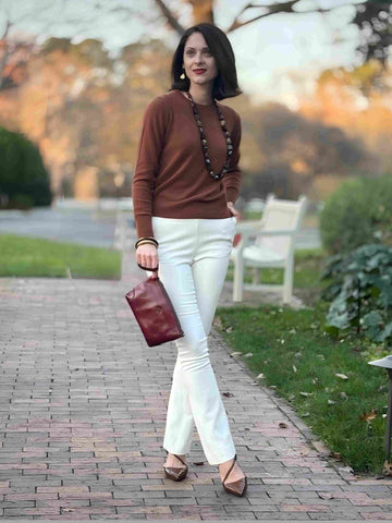 Very attractive sweater than looks classic. I like it with black slacks, but you can also wear it with jeans or leggings. The round neck is flattering. It is perfect for cooler but not frigid weather. Not itchy at all since it is cotton. It is somewhat form fitting, not tight but also not baggy.