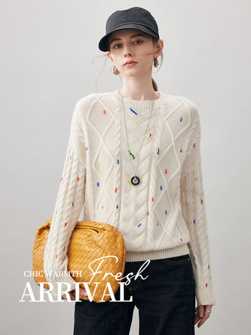 Beautiful sweater!! The cable knit work is very pretty! It’s thick, warm and very cozy. I bought one for myself and 2 for gifts!!
