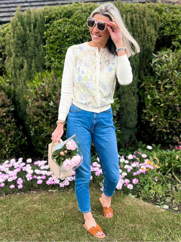 This cardigan is beautiful in person. The floral pattern is very eye-catching, and the buttons add a nice touch. The material is incredibly soft and feels great. This is perfect for layering when it’s a bit colder outside.