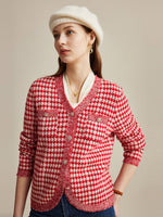 Add a touch of timeless elegance to your wardrobe with our Elegant Red and White Houndstooth Cardigan. Crafted from 100% soft, comfortable wool, this cardigan is designed to keep you warm while ensuring you look effortlessly stylish.