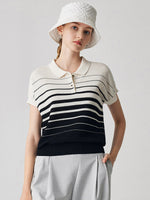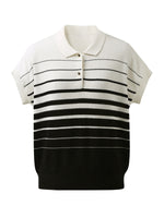 Elevate your wardrobe with this chic striped polo knit t-shirt. The soft, breathable fabric features a stylish gradient of stripes, creating a modern and polished look. The flattering polo collar and button-down detail, paired with the comfortable fit, make this top a perfect choice for both casual and semi-formal occasions.